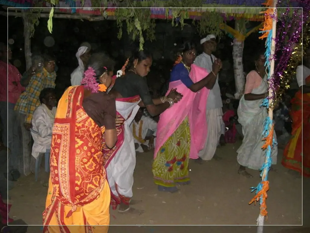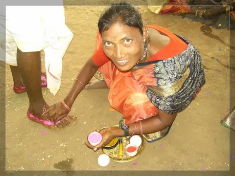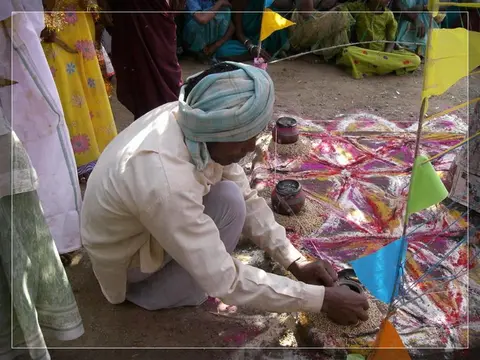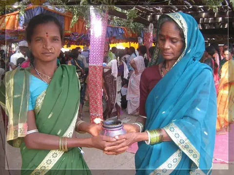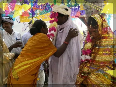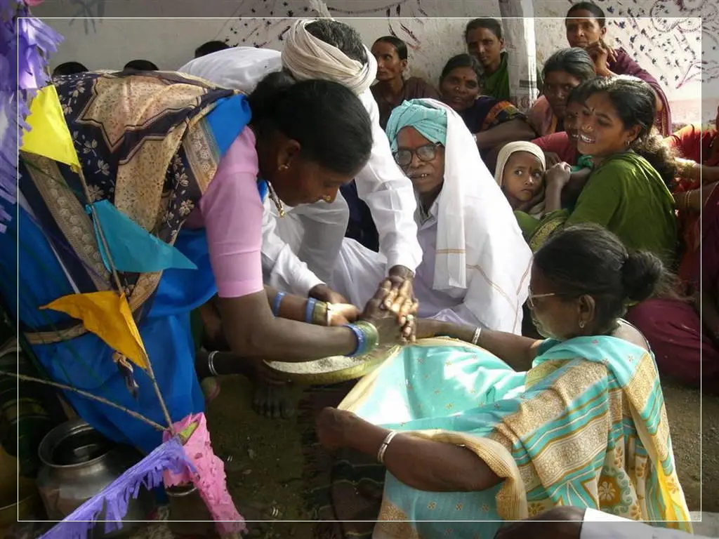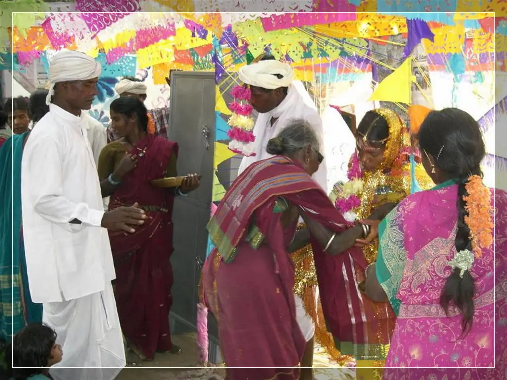Our people give much importance to marriage. In our community these marriages now happen in four ways: marriage, second marriage, second wife (sivar sonval), and elopment. For a normal marriage, after the ceremony of deciding on the girl, they do the engagement ceremony. On the day of engagement they select which day the marriage will be. Two or three days before the day of the marriage they will give a sacrifice to the village diety, hold a feast for the village people and make them the bride and groom. On the wedding day, there are deeds like lagḍing, kōḍa-kukḍi, dēva-dēvi, pāri jēvun, and manḍa sūḍle vāyval.