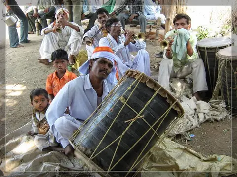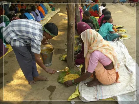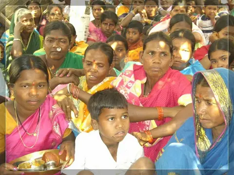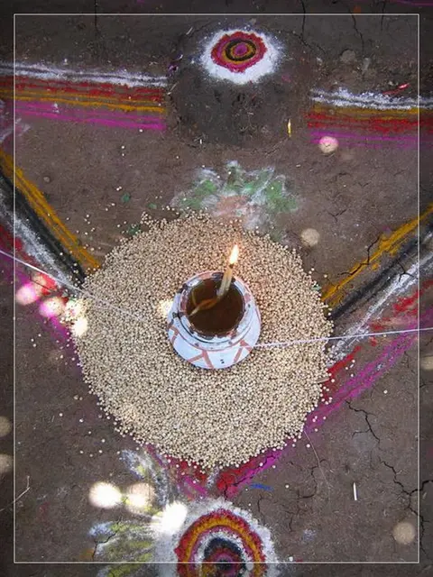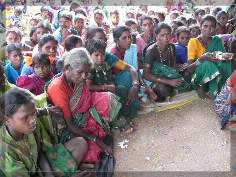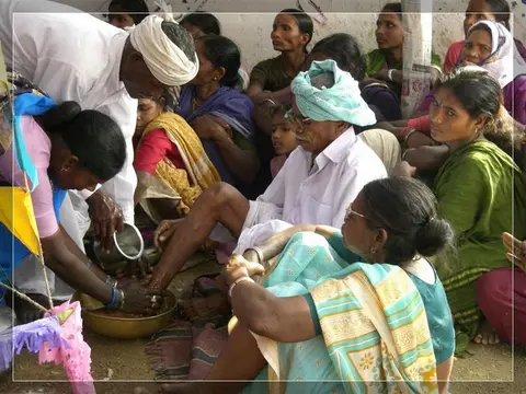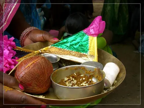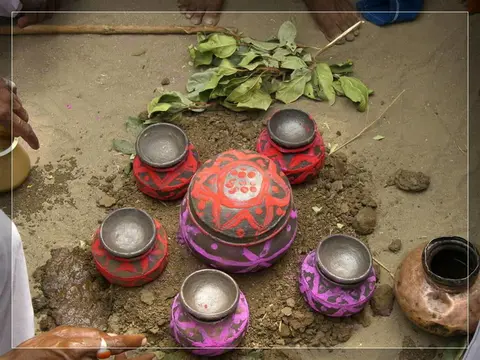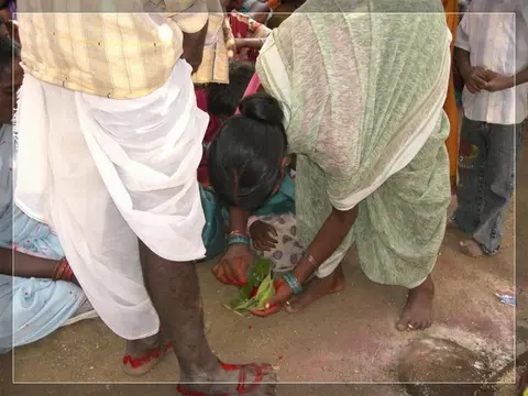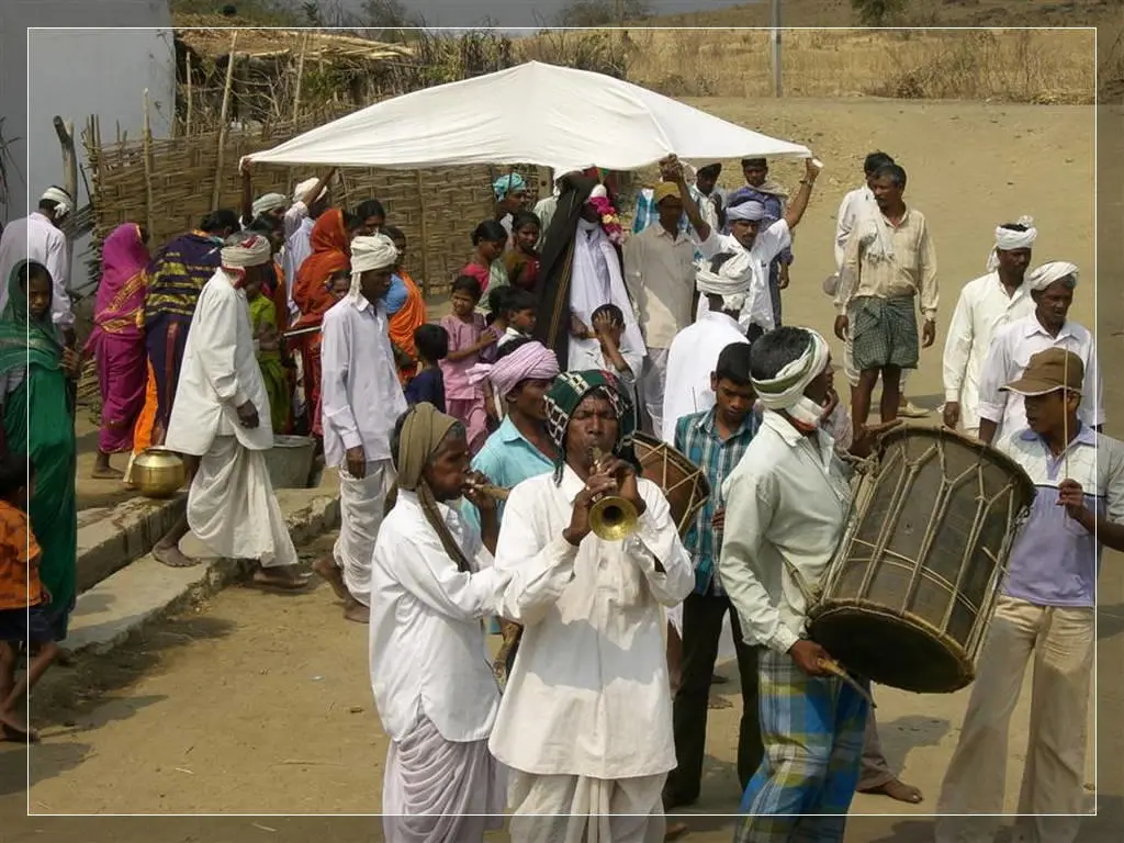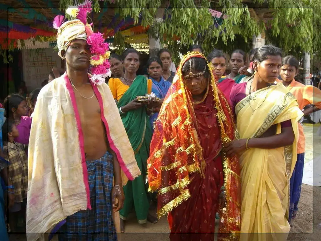 Our people give much importance to marriage. In our community these marriages now happen in four ways: marriage, second marriage, second wife (sivar sonval), and elopment. For a normal marriage, after the ceremony of deciding on the girl, they do the engagement ceremony. On the day of engagement they select which day the marriage will be. Two or three days before the day of the marriage they will give a sacrifice to the village diety, hold a feast for the village people and make them the bride and groom. On the wedding day, there are deeds like lagḍing, kōḍa-kukḍi, dēva-dēvi, pāri jēvun, and manḍa sūḍle vāyval.